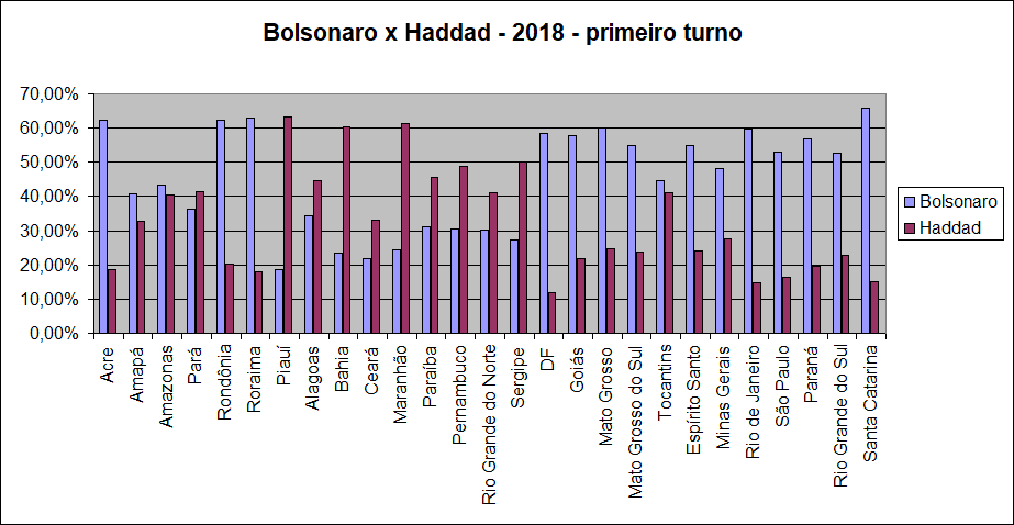 N | Amapá | 40,74% | 32,77% | Haddad - vence, mas não chega a 50% | |||||||||||||||||||